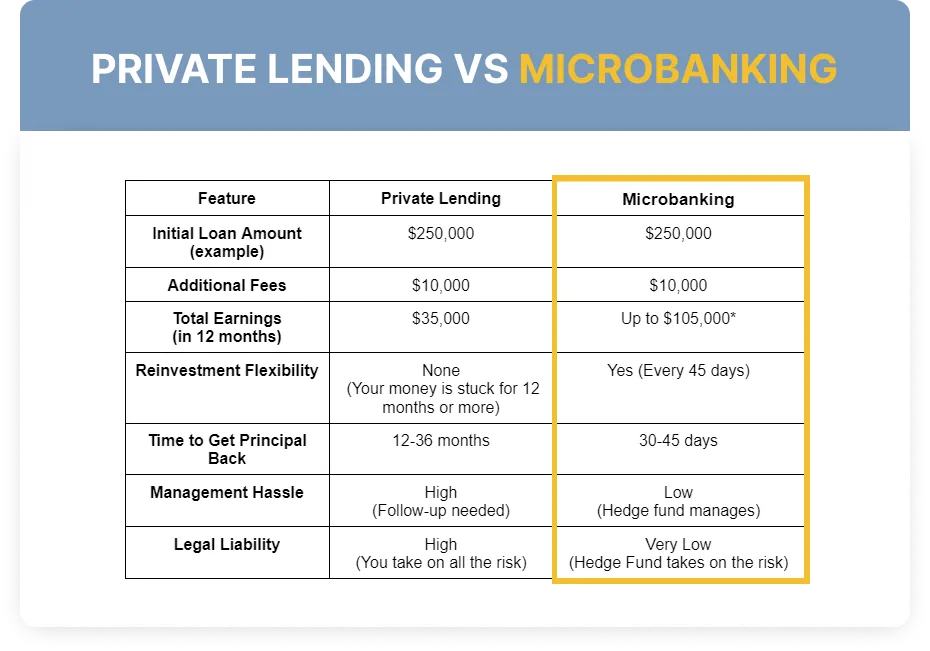 Think of the Microbanking Method as the smarter, leaner cousin of traditional real estate investing. Unlike the usual route that involves hefty down payments, dealing with tenants, and unpredictable market risks, Microbanking puts you in the driver’s seat with less hassle. You lend the money, you set the terms, and you reap the rewards, all while keeping your investment secure. It’s real estate investing, but with the volume turned up on profits and turned down on headaches.