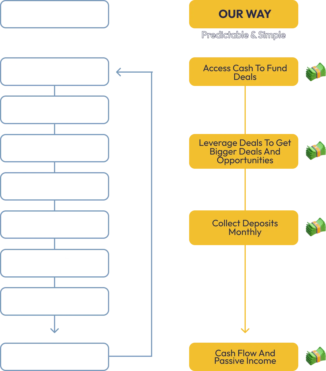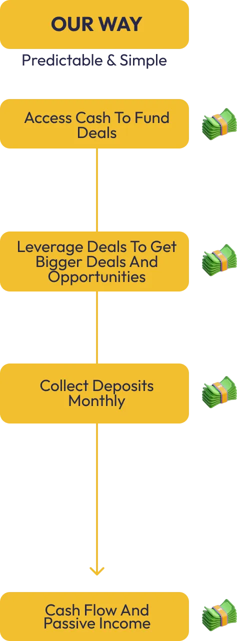 We achieve this by following 3 steps that allow you to access cash for deals, leverage deals to get even bigger opportunities and then collect deposits monthly… without struggling as a real estate investor following the “normal” techniques.